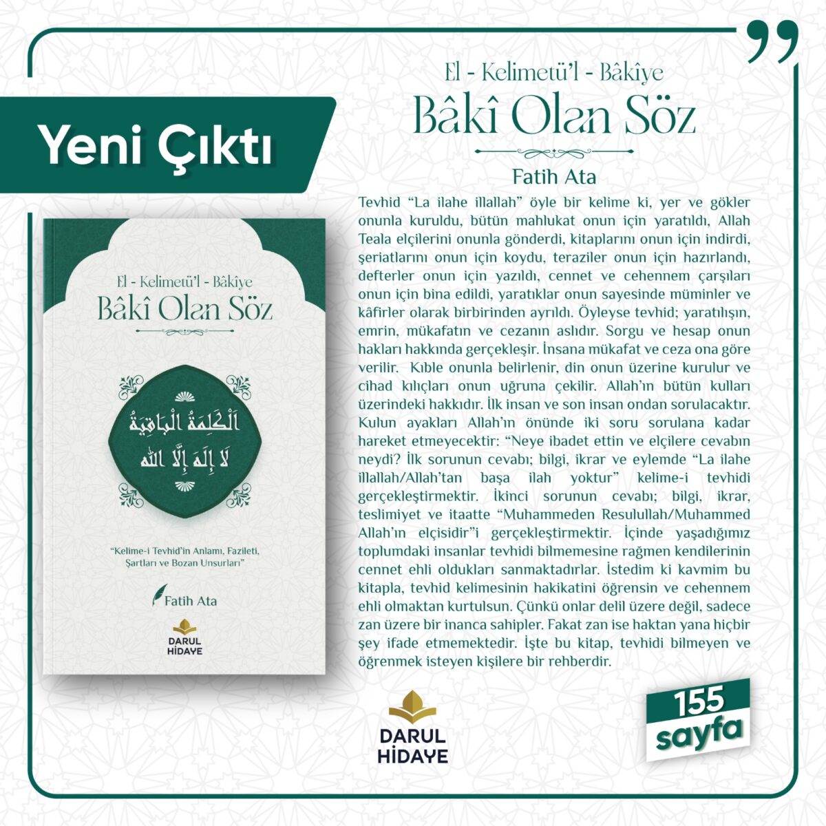 Tevhid “La ilahe illallah” öyle bir kelime ki, yer ve gökler onunla kuruldu, bütün mahlûkat onun için yaratıldı, Allah Teala elçilerini onunla gönderdi, kitaplarını onun için indirdi, şeriatlarını onun için koydu, teraziler onun için hazırlandı, defterler onun için yazıldı, cennet ve cehennem çarşıları onun için bina edildi, yaratıklar onun sayesinde müminler ve kâfirler olarak birbirinden ayrıldı. Öyleyse tevhid; yaratılışın, emrin, mükâfatın ve cezanın aslıdır. Sorgu ve hesap onun hakları hakkında gerçekleşir. İnsan mükâfat ve ceza ona göre verilir. Kıble onunla belirlenir, din onun üzerine kurulur ve cihad kılıçları onun uğruna çekilir. Allah’ın bütün kulları üzerindeki hakkıdır. İlk insan ve son insan ondan sorulacaktır. Kulun ayakları Allah’ın önünde iki soru sorulana kadar hareket etmeyecektir: “Neye ibadet ettin ve elçiye cevabın neydi? İlk sorunun cevabı; bilgi, ikrar ve eylemle “La ilahe illallah/Allah’tan başka ilah yoktur” kelime-i tevhidi gerçekleştirmektir. İkinci sorunun cevabı; bilgi, ikrar, teslimiyet ve itaatle “Muhammedun Resulullah/Muhammed Allah’ın elçisidir”i gerçekleştirmektir. İçinde yaşadığımız toplumdaki insanlar tevhidi bilmemesine rağmen kendilerini cennet ehli olduklarını sanmaktadırlar. İslâmî içi kavrulmuş bu kitapla, tevhid kelimesinin hakkâniyetin öğrenen ve cehennemi ehlî olmaktan kurtulsun. Çünkü dili üzeri şehadet, esasen öz üzer bir inanca sahipler. Fakat zani ise hatalı yana hiçbir şey ifade etmemektedir. İşte bu kitap, tevhidi bilmeyen ve öğrenmek isteyen kişiler için bir rehberdir.